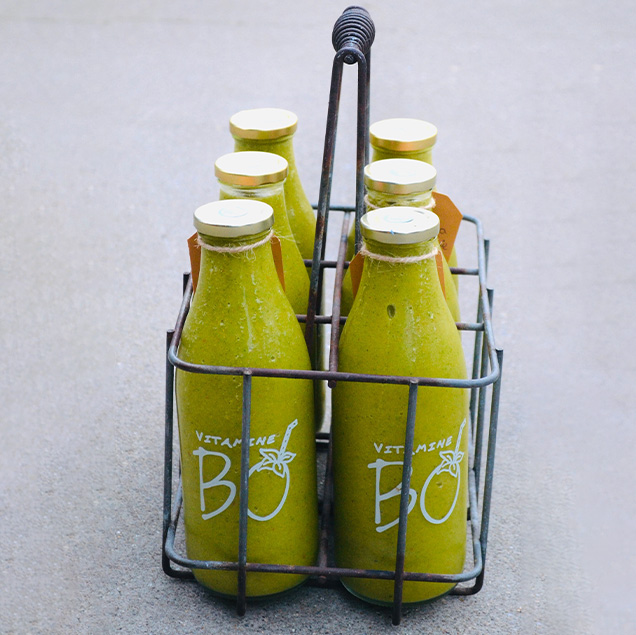 Weet je nog, dat vroeger de melkboer voor de deur stond met een rekje vol melkflessen? Vitamine Bo geeft jou graag dat gevoel van vroeger weer en daarom bezorgen we nu een rekje met verse smoothies in ‘melkflessen’.